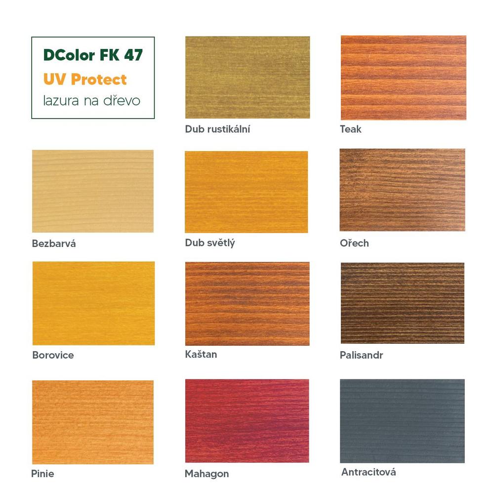 Lazura DColor FK 47 UV Protect má dobré penetrační schopnosti s tím, že umožňuje regulaci vlhkosti ve dřevě. Díky speciálním přísadám nano oxidů kovů a chemické UV ochrany je revolučním podkladem, který chrání dřevo proti oxidaci a je možné ji použít i k úpravě tvrdých dřevin s vysokým obsahem silic.